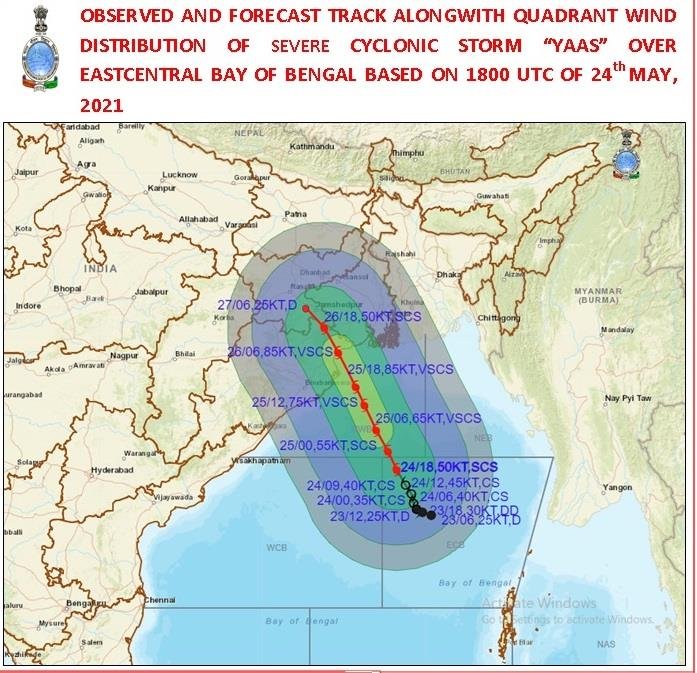 “The severe cyclonic storm Yaas over east-central Bay of Bengal moved north-northwestwards with a speed of about 9 kmph during past six hours and lay centred at 9 UTC of May 24 over east-central Bay of Bengal,” IMD said in its bulletin.